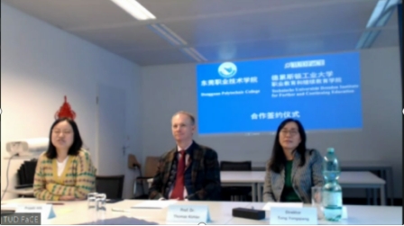双方在线签署了《德累斯顿工业大学职业教育及继续教育学院和东莞职业技术学院合作备忘录》,将在师资共育、人才共培、学术共研等方面深化合作,扎实推进我校“双高计划”“十四五”规划等重点任务建设。