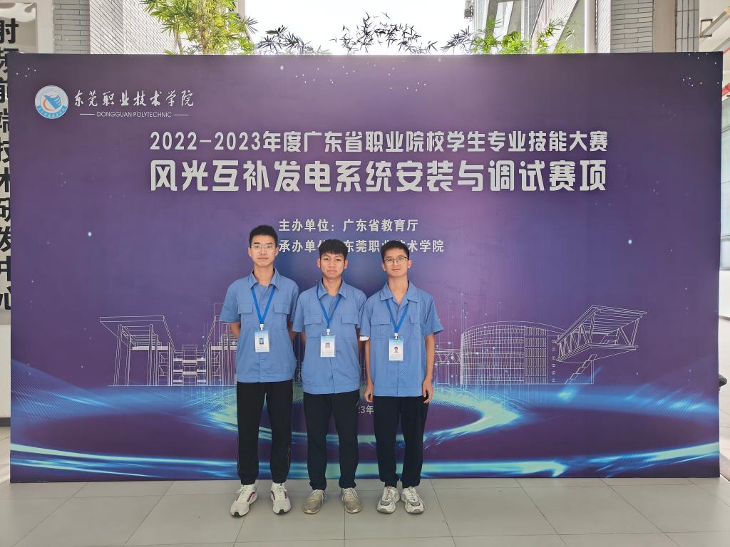 近日,由广东省教育厅主办的2022—2023年度广东省职业院校学生专业技能大赛 风光互补发电系统安装与调试赛项在我校敬业楼504顺利举行。来自全省19所职业院校的57名选手同台竞技,我校电子信息学院罗云飞、李杰樑、吴志轩3名学子经过激烈比拼,以第一名的成绩荣获省赛一等奖。