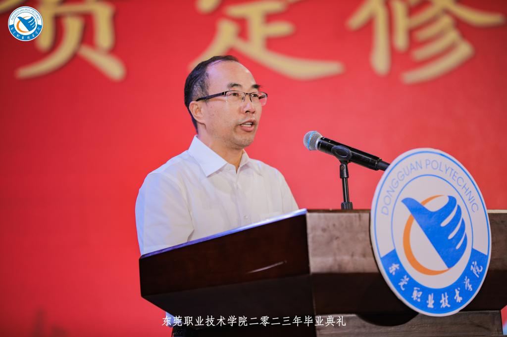 党委副书记、校长贺定修在典礼上致辞。他向顺利完成学业的同学们表示祝贺。他表示,过去三年,对同学们、对学校、对整个社会来说都是极不平凡的三年。疫情虽然给我们带来了前所未有的挑战,但它阻挡不了我们勇毅前行的步伐。在这三年里,我们共同见证了祖国复兴路上的伟大荣光、共同翻开了学校提质升级的崭新画卷、续写了东职学子拼搏成长的动人故事。