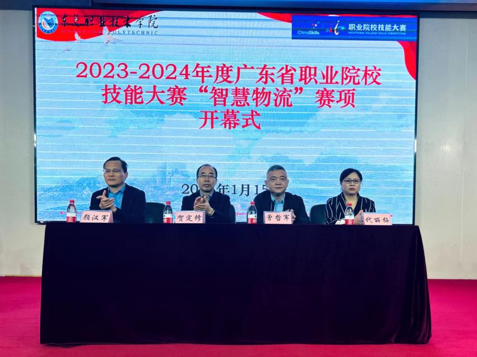 由广东省教育厅主办,我校承办的2023-2024年度广东省职业院校技能大赛智慧物流赛项于2024年1月15日-17日在我校举行。开幕式于2024年1月15日在我校图书馆学术报告厅拉开帷幕。我校党委副书记、校长贺定修,商贸学院党总支书记、院长颜汉军,省教育厅督察、广州番禺职业技术学院教务处副处长曾哲军,深圳市中诺思科技股份有限公司副总经理代丽梅出席开幕式。