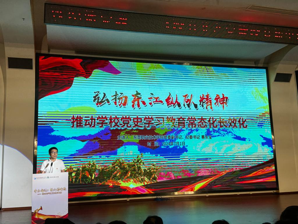校党委副书记、纪委书记蔡东宝以《弘扬东江纵队精神 推动学校党史学习教育常态化长效化》为主题讲授党课,蔡书记通过讲授广东历史英雄故事强调党史学习教育的重要性,他表示学校以弘扬伟大抗战精神和东江纵队精神为主题,向学校师生开展常态化、长效化的党史学习教育,引导广大师生传承红色基因、赓续红色血脉,弘扬伟大抗战精神,厚植爱党、爱国、爱社会主义的情感,从中汲取前行力量。