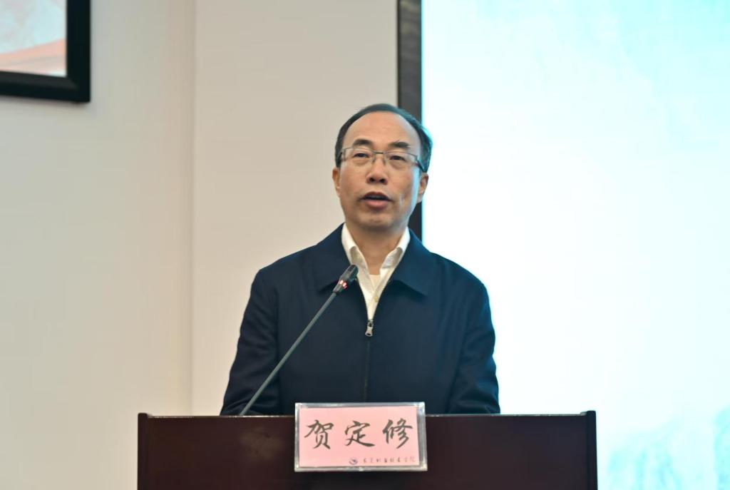 贺定修校长对丁金昌会长来校指导表示欢迎和感谢,要求全体参会人员认真学习、深刻领会,在思想上、行动上为“新双高”的申报和建设做好准备。