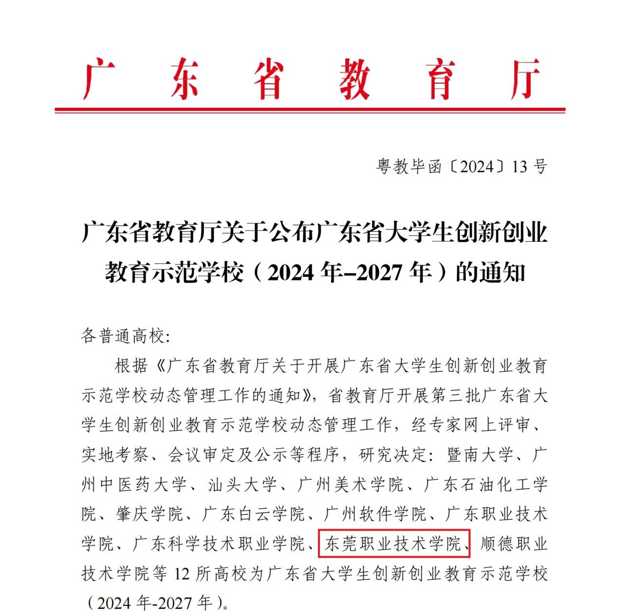 近年来,学校以“依托东莞智造、服务湾区经济、协同培育知行合一的创新创业人才”为育人理念,不断深化创新创业教育改革,凝练了“三方协同、四阶递进、五维一体”的育人模式,“双创”教育工作特色凸显。接下来,学校将以入选新一轮广东省大学生创新创业教育示范学校为契机,认真学习践行习近平总书记给中国国际大学生创新大赛(2024)参赛学生代表的重要回信精神,持续推动产教融合、科教融汇,以创新创业教育助力学校“新双高”建设。