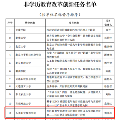 本次申报由省级教育行政部门组织、审核、推荐,全国高校共申报956项任务。经过教育部初审、复审、公示等环节,共评选出23个终身学习制度建设任务、61个学历继续教育教学改革创新任务、32个自学考试改革创新任务、103个非学历教育改革创新任务和50个三教统筹协同创新任务。我校建筑学院院长杨润丰申报的《东莞市智能建筑行业终身教育学分银行制度实践应用》项目入选终身学习制度建设任务榜单,人工智能学院刘丽萍老师申报的《社区教育中非遗文化的德育价值及其实现路径研究——以东莞茶山镇茶山公仔为例》项目入选非学历教育改革创新任务榜单。